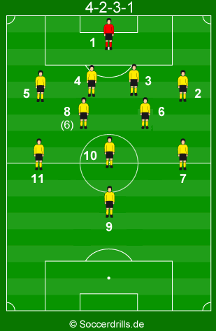 Das Mittelfeld im 4-2-3-1 ist sehr flexibel. Mit der Nummer 10 haben wir einen echten „Spielmacher“ und mit den beiden Außenspielern, verfügen wir fast über echte Flügelangreifer. Ständige Vorstöße der Spieler in die Offensive, am besten abwechselnd, sorgen für Irritationen in der gegnerischen Abwehr.