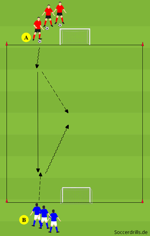 - Jedes Eins-gegen-Eins beginnt jeweils mit einem Zuspiel von außerhalb auf den aktiven Angreifer A, der sich im Zweikampf gegen den Verteidiger B durchsetzen und auf das Minitor abschließen soll. B darf nach eigenem Ballgewinn auf das gegenüberliegende Tor kontern.