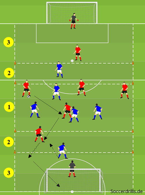 - In der Mittelzone 1 spielt das ballbesitzende Team drei Pässe und darf dann zu ihrem jeweiligen Angreifer in Zone 2 spielen. Dieser soll das Eins-gegen-Eins gegen den Verteidiger in Zone 3 lösen und zum Abschluss auf das Großtor kommen.