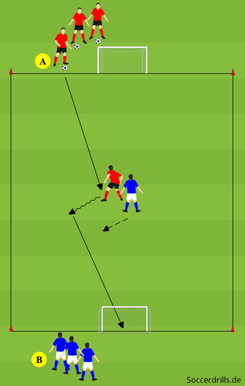 - Der Verteidiger A dribbelt kurz an und spielt auf den Angreifer B, welcher den Ball ins Feld mitnimmt und A im frontalen Eins-gegen-Eins überwinden soll. A darf nach eigenem Ballgewinn auf das gegenüberliegende Tor kontern.