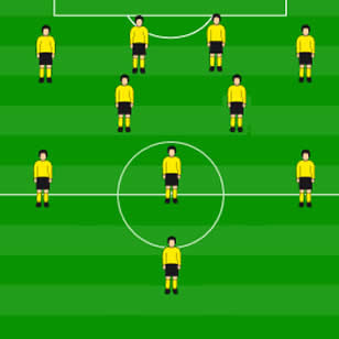 Zum Aufbau werden 10 Bodenmarkierungen benötigt. An der Mittelline, jeweils neben dem Mittelkreis, markieren wir ein Dreieck. In der Spitze in einiger Entfernung vor dem Strafraum legen wir drei weitere Markierungen aus. Im 4-2-3-1-System ist dies die 3. Vor der zentralen Markierung befindet sich eine weitere Markierung, sie markiert die Position unseres Achters. Falls du mit den markierten Positionen nicht klar kommst, lese bitte "Spielsysteme - Grundlagen des 4-2-3-1".