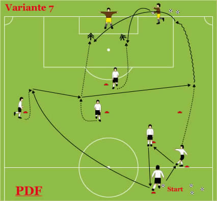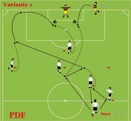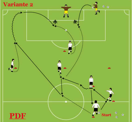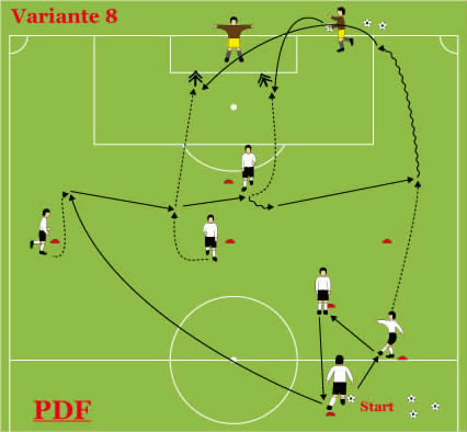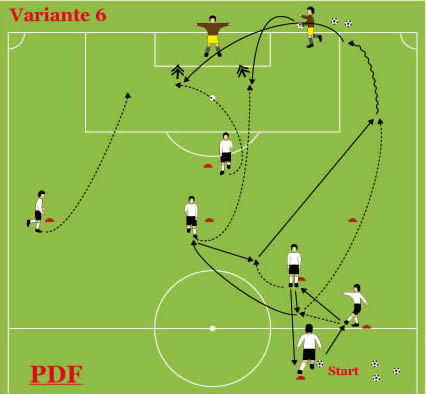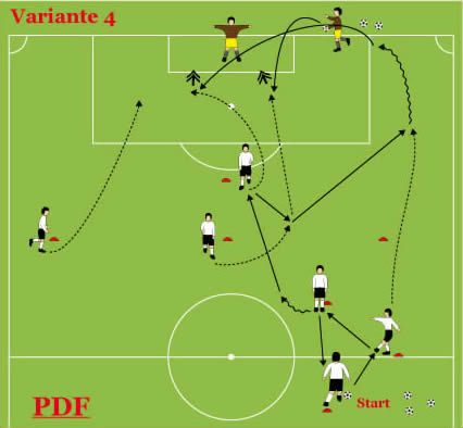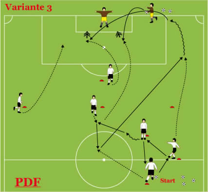 Du erkennst in den Grafiken und Videos einen zweiten Torhüter, der neben dem Tor steht und einige Bälle zur Verfügung hat. In den Abläufen ziehen die beiden zentralen Spieler ständig zum Tor, um abzuschließen. Es wird nur einer dieser Spieler zum Abschluss kommen und der andere bekommt vom Torwart neben dem Tor einen Ball zugeworfen oder zugerollt, je nach dem, was die Situation hergibt. Der Torwart muss dabei den Ablauf genau beobachten und sofort dem entsprechenden Spieler den Ball zur Verfügung stellen. Dieser soll schnell reagieren und den Torerfolg suchen.