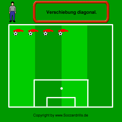 Jeder Spieler hat einen Ball. Die Spieler dribbeln in einer Linie übers Feld, dabei verschieben sie sich diagonal. Die Abstände zwischen den Spielern bleiben immer gleich.