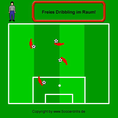 Freies Dribbling der Spieler. Auf Zuruf sollen sich die Spieler schnell orientieren und den kürzesten Weg zur Seitenlinie suchen. Guter Orientierungssinn ist eine wichtige Voraussetzung für das Gelingen der Abstimmung in der Viererkette.