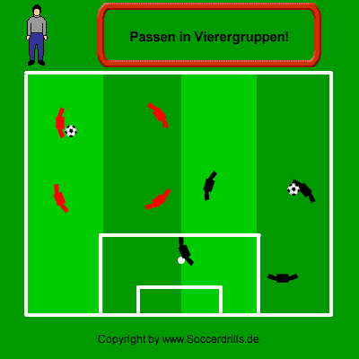 In einem begrenzten Übungsfeld spielen sich Vierergruppen innerhalb der einzelnen Gruppen den Ball zu. Auf Signal des Trainers postieren sich die Gruppen jeweils auf einer Linie nebeneinander. Ein Spieler auf dem Kettenflügel hält den Ball.