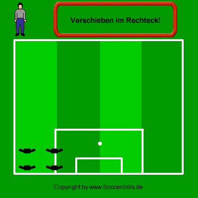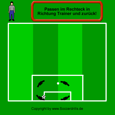Der Weg des Rechtecks ist vorgegeben, die Spieler können sich ganz auf das Passen und die Abstände konzentrieren. Der Schwierigkeitsgrad kann durch schnelles Kurzpassspiel noch erhöht werden. Die Entfernungen zwischen den Spielern sollen in diesem Übungsablauf konstant bleiben.