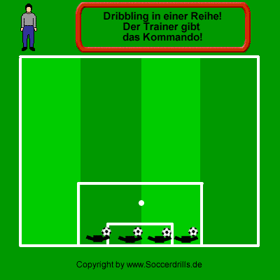 Die Spieler dribbeln in Vierergruppen auf einer Linie dicht nebeneinander. Auf Signal des Trainers dribbeln sie fächerartig auseinander. Beim nächsten Kommando dribbeln sie wieder in die Ausgangsposition zurück.