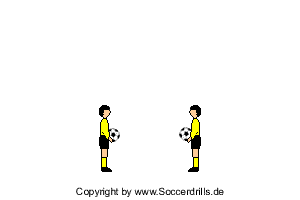 Die Spieler stehen sich, jeweils mit Ball, frontal gegenüber. Einer passt direkt und mit Druck, der andere Spieler indirekt (Bodenpass) zum Gegenüber. In der Animation ist der Ablauf der Übung deutlich zu erkennen.