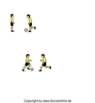 Im oberen Teil der Animation dribbelt ein Spieler vorwärts und der Andere läuft rückwärts. Der Dribbler tritt irgendwann oder auf Trainerkommando auf den Ball. Der Ball ruht und der Partner ohne Ball läuft vorwärts und übernimmt den Ball.