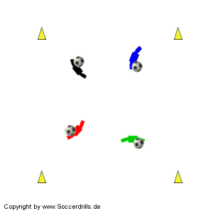 Material: 1 Ball pro Spieler, 4 Hütchen oder Bodenmarkierungen zur Begrenzung des Übungsfeldes.