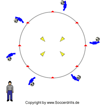 Als Übungsfeld eignet sich der Mittelkreis. Steht dieser nicht zur Verfügung, markiere einen Teller-Kreis. Vier Hütchen liegen im Kreis und Zeigen mit den Spitzen in die Mitte zur "Bergspitze". Die Spieler dribbeln im Kreis und versuchen, die Abstände zueinander nicht zu verändern. Auf Kommando des Trainers erfolgt ein sofortiger Richtungswechsel. Beim Dribbling gegen den Uhrzeigersinn wird mit dem rechten Fuß gedribbelt, im Uhrzeigersinn mit links.