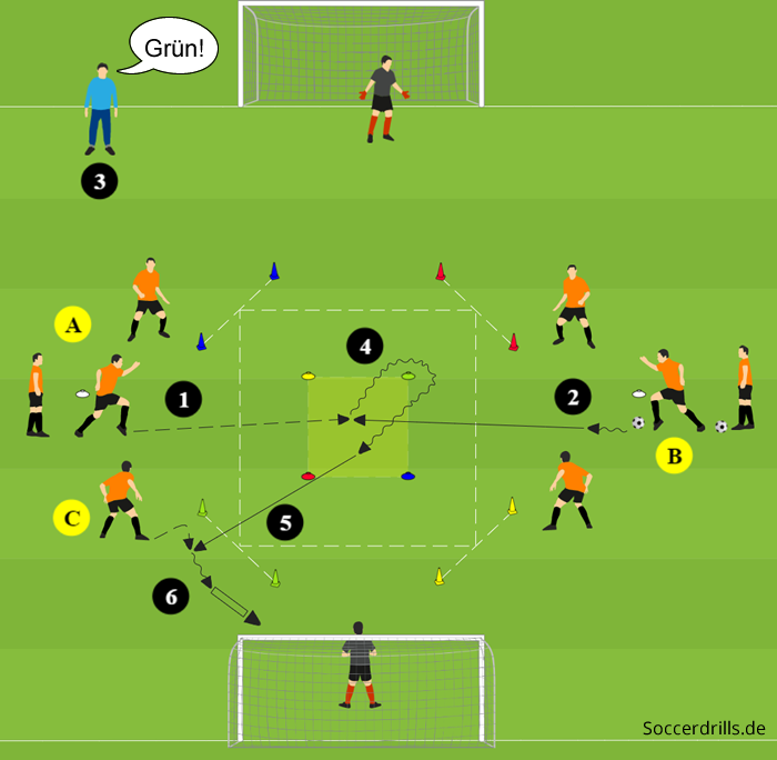 - Es folgt der Pass durchs Hütchentor zum Mitspieler C, der sich im Tor mit der aufgerufenen Farbe anbietet.