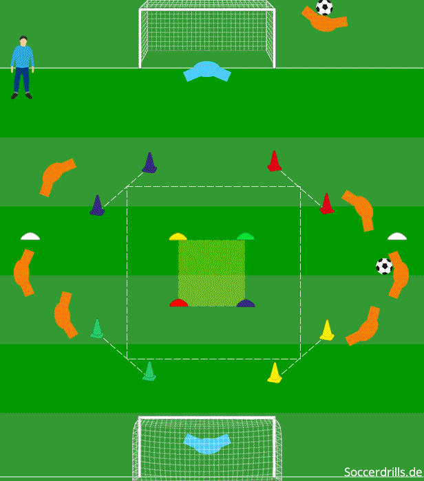 Material: 2 Markierungen für die Startspieler, 4 x 2 verschiedenfarbige Hütchen, 4 verschiedenfarbige Bodenmarkierung (entsprechen den Farben der Hütchen), 2 Tore und ausreichend Bälle.