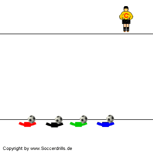 Der Trainer zeigt mit farbigen Karten oder gibt Zeichen mit seinen Armen. Nicht rufen, die Spieler sollen beim Dribbeln den Kopf anheben. Nach dem STOPP-Zeichen sofort auf den Ball treten und anhalten. Der Fuß muß auf dem Ball stehen. Wer sich nach dem STOPP-Zeichen noch bewegt muß zum Start zurück.