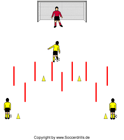 Diese Übung könnte auch unter "Torschuss" aufgeführt werden. Viele Übungsformen vereinen mehr, als nur ein Thema. Wir haben uns hier für die Rubrik "Dribbling" entschieden. Der Aufbau wirkt relativ schwierig, aber nur auf den ersten Blick. Wir haben in unsrerer Animation die Übung sofort von beiden Übungsseiten dargestellt.