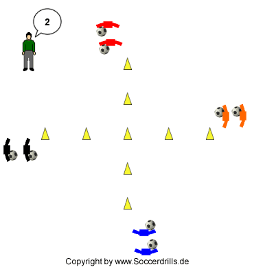 Der Trainer ruft eine Nummer. Die Spieler umdribbeln da aufgerufene Hütchen und bewegen sich anschließend in ihre Startgruppe zurück. Vergiß nicht den Staffelwettkampf zwischen den Gruppen.
