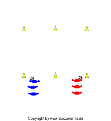 Feldgröße: 3-4 Meter Abstand zwischen den Hütchen an den Längsseiten. 5-6 Meter vertikaler Abstand.