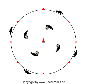 Die Spieler dribbeln vom Kreisrand zum Hütchen und legen dort den Ball ab. Anschließend wird das Hütchen umlaufen und der abgelegte Ball auf der anderen Seite des Hütchens dribbelnd mit auf die andere Übungsseite genommen. Dieses Variante funktioniert natürlich nur, wenn es auf der anderen Seite auch eine Gruppe mit Spielern gibt.