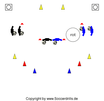 Material: Ausreichend Bälle, dreimal jeweils zwei gleichfarbige Hütchen, 2 Bodenmarkierungen, 1 Hütchen- oder Kleintor.