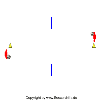 Die Startspieler dribbeln von beiden gleichzeitig jeweils zu einer Stange. In unserer Animation wird dort der Ball abgelegt und die Spieler laufen auf die andere Übungsseite, um dort den Ball des Mitspielers zu übernehmen. Dann dribbeln sie in die Startgruppe weiter.