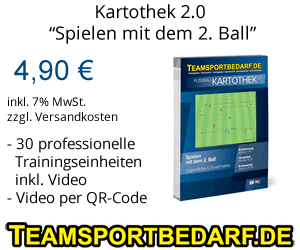 Material: 1 Ball pro Spieler, 4 Bodenmarkierungen, 4Hütchen fürs Quadrat im Zentrum.