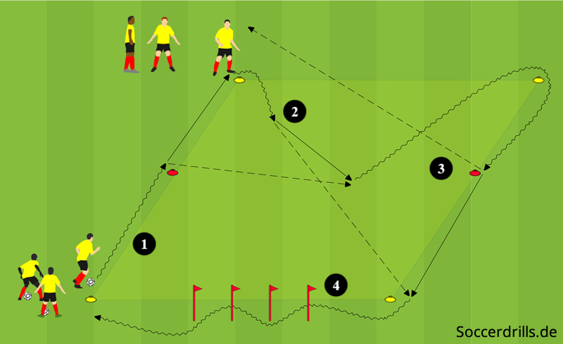 - Der Startspieler kontrolliert den Ball im Zentrum und dribbelt diagonal weiter. Es geht um die Markierung herum und nach einem längeren Dribbling, folgt der Pass zum Startspieler. Anschließend läuft er auf die Startposition der Gruppe oben links.