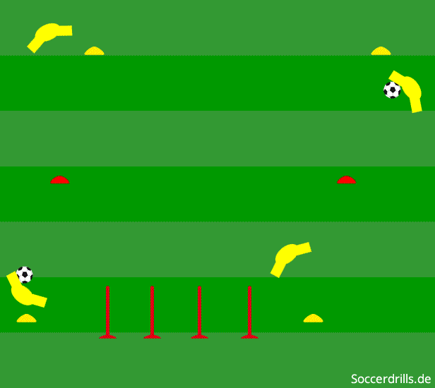 - Der Spieler erwartet den Ball in offener Stellung, zieht ihn an der Markierung vorbei und starte in den Slalomparcours. Danach schließt er sich mit Ball der Startgruppe an.