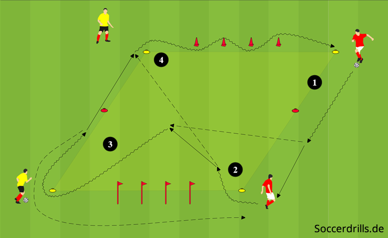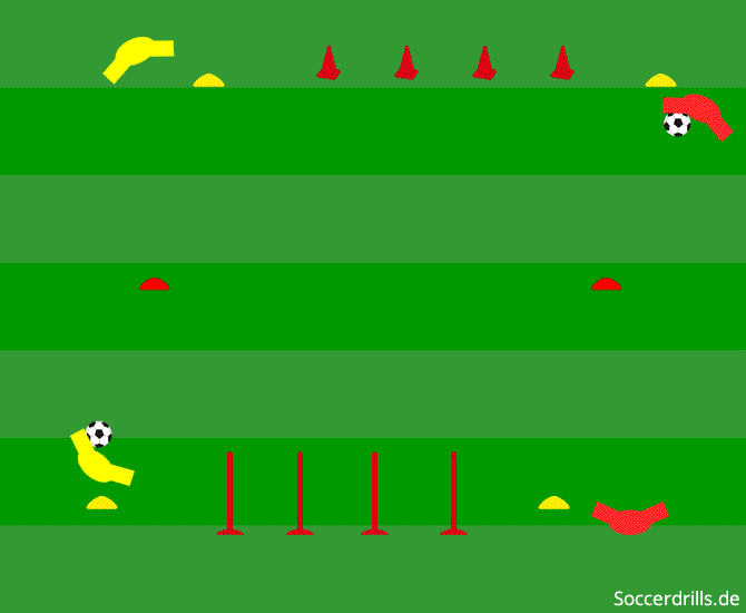 In der Animation erkennst du den Ablauf von beiden Seiten gleichzeitig, dies ist nochmal eine Steigerung zum einfachen Seitenwechsel. Theoretisch kann die Trainingsübung von insgesamt 4 Spielern ausgeführt werden und das von beiden Seiten gelichzeitig. Allerdings ist dies eine hohe Belastung und es wird schwer, sich zu konzentrieren. Es gilt, so wenige Spieler wie möglich, ohne sie zu überfordern.