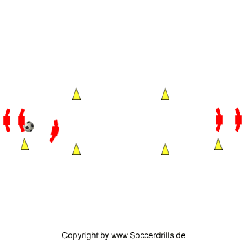 Baue ein Übungsfeld auf, wie in der Animation zu erkennen. Der erste Spieler mit Ball dribbelt nach links, führt dort eine Drehung aus und gelangt zur nächsten Markierung. Von dort dribbelt er geradlinig zum nächsten Hütchen. Es folgt eine 90 Grad Wende und das Dribbling zur letzten Markierung im Feld. Jetzt Drehung und wieder zurück zur vorherigen Position. Abschließend passt der Spieler in die nächste Gruppe, erhält den Ball zurück und spielt in den Lauf des gestarteten Mitspielers. Von hier geht die Reise in die andere Richtung.