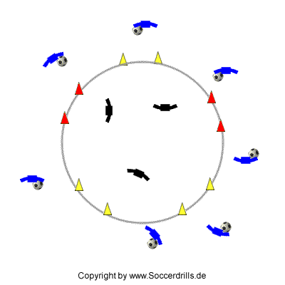 Material: Jeder Spieler am Kreis hat einen Ball, Markierungen für Tore, Kreis oder Kreismarkierung.