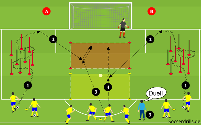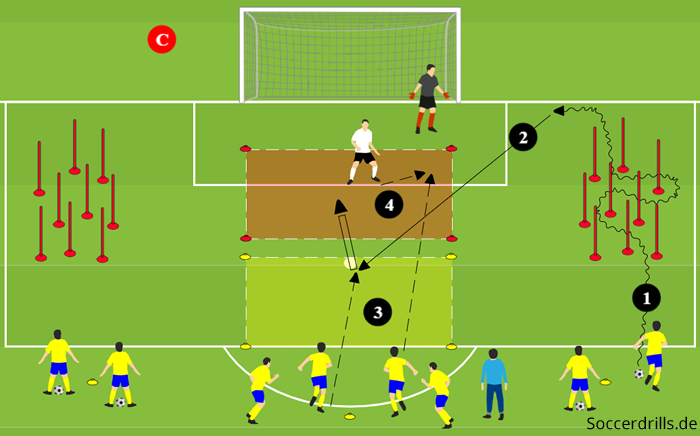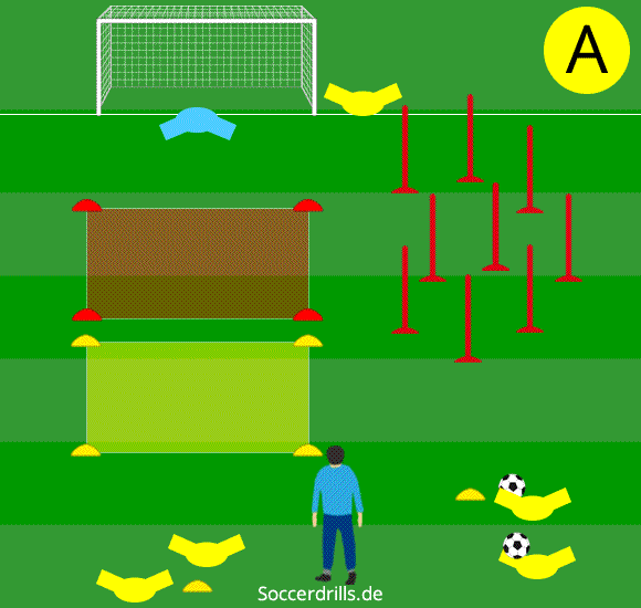 - Am Flügel wird ein Stangenwald aufgebaut und zentral vor dem Tor Zonen markiert (Grafik = rot und gelb).
