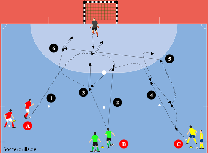 - C startet ins kurze Dribbling und passt zu A. A passt zu C zurück, danach wird A wird zum Abwehrspieler.