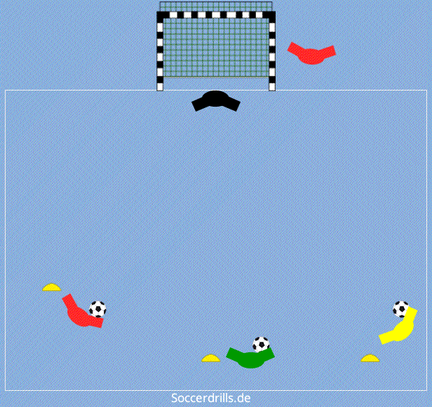 - Die Spieler werden an den drei Startpunkten aufgeteilt, jeder hat einen Ball und ein Torwart geht ins Tor.