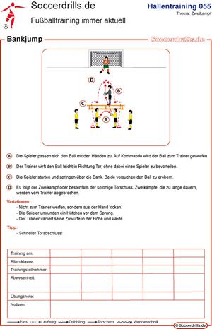 In dieser Zweikampf-Übung geht es darum, einen springenden Ball zu kontrollieren und gleichzeitig den Zweikampf zu gewinnen. Den Trainer haben wir dazu auf eine Bank gestellt, er wirft oder rollt den Ball ab. Er kennt seine Spieler und weiß bei jedem Paar, was er zu machen hat.