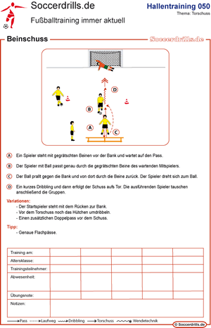 Ob "Beinschuss" oder "Tunneln", egal wie wir es nennen, es gehört zu Fußball einfach dazu. Hier in der Übung ist es so gewollt, denn der Spieler der getunnelt wird, soll schnell reagieren, damit er mit einem Torschuss abschließen kann. Damit das nicht zu einfach wird, nutzen wir in der Halle eine Bank. Diese sorgt auch dafür, dass der Ball flach gehalten wird.