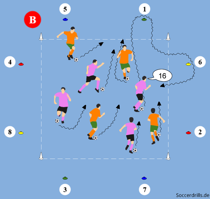 - In der Grafik wird „16“ gerufen. Entsprechend dribbeln alle Spieler und der Navigator um die Bodenmarkierung 1, kehren ins Feld zurück, dann 6 und kehren wieder ins Spielfeld zurück.