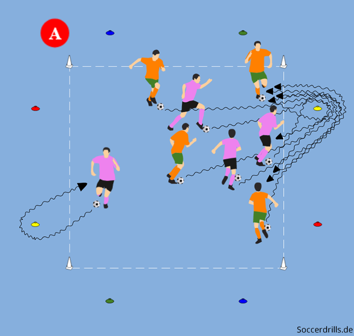 - 4x2 verschiedenfarbige Bodenmarkierungen, 4 Hütchen, jeder Spieler hat einen Ball.