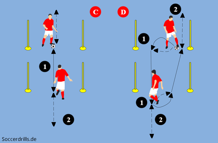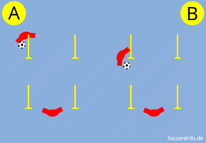 - Der Spieler oben hat die Position dort eingenommen und stößt den Ball mit dem ersten Kontakt, mit dem linken Innenrist innen an der Stange vorbei und umläuft sie auf der anderen Seite. Anschließend beginnt der Ablauf von vorne.