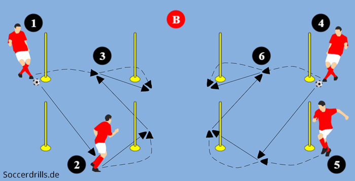 - Nach jedem Pass führen die Spieler drei, vier kurze Schritte rückwärts aus und starten dann wieder vorwärts zum Ball.