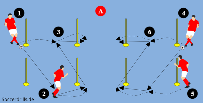 - Der Spieler oben hat die Position dort eingenommen und stößt den Ball mit dem ersten Kontakt, mit dem rechten Innenrist, an der Stange vorbei. Anschließend beginnt der Ablauf von vorne.