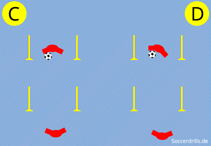 In den Abläufen A und B erfolgt der erste Kontakt zur Seite, die Stangen werden dabei geschickt umspielt und mit dem zweiten Kontakt erfolgt bereits der Rückpass ins gegenüberliegende Stangentor. Es geht weiter mit dem ersten Kontakt nach vorne, der Weg ist frei, nichts stört und der Ball wird durch die Vorwärts- und Rückwärtsbewegung erlaufen. Dabei kann kurz zwischen dem ersten und zweiten Kontakt der Kopf angehoben werden, um die Position des Mitspielers zu scannen. In Ablauf D fordern wir eine technische Einlage, der Ball wird mit dem ersten Kontakt ums Standbein geführt und mit dem zweiten Kontakt auf die andere Seite gepasst.