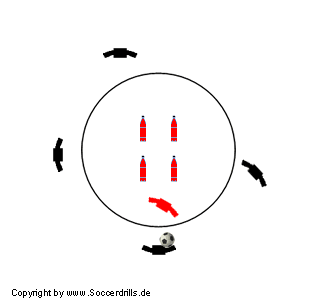 Der Spieler in der Mitte versucht das Flaschenfeld zu verteidigen. Es darf kein Ball aus dem Feld zurückgeholt werden, um einen reibungslosen Übungsablauf zu gewährleisten. Die Außenspieler dürfen sich die Bälle zuspielen, um in eine bessere Schussposition zu kommen. Sind sämtliche Flaschen umgefallen, wird der Verteidiger durch einen anderen Spieler ersetzt.