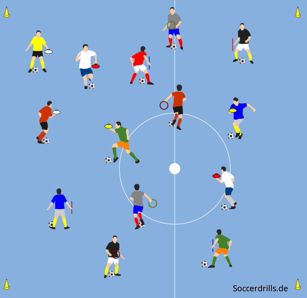 - Die Spieler bewegen sich frei im Übungsfeld, zunächst ohne Bälle.