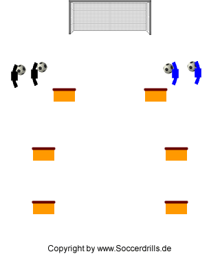 Wir bauen einen Kastengarten auf. Dazu nehmen wir sechs Kästen und schon können die Spieler beginnen, kreuz und quer zu dibbeln. Der Dribbelweg ist extra so gewählt, dass sie sich ständig begegnen. Es ist erforderlich immer wieder den Kopf zu heben, um Zusammenstöße oder Ballverluste zu vermeiden und genau das wollen wir erreichen. Am Ende der Dribbelstrecke haben wir dann noch einen Torschuss eingebaut. Steht kein Tor zur Verfügung, kann auf den Torschuss verzichtet werden.