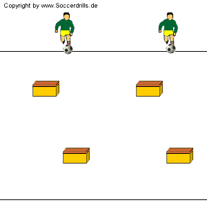 Die Kästen bieten sich zum Dribbling an. Wir können das Training der Ballkoordination fußballspezifisch durchführen. Durch den möglichen Wettkampf kommen wir ins Koordinationstraining unter Gegnerdruck.