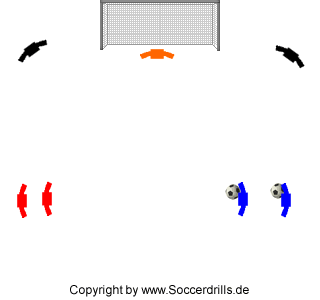Die ersten beiden Spieler jeder Reihe passen sich einen Ball zu. Nach einiger Zeit, oder auf Kommando des Trainers, erfolgt ein Pass auf einen Spieler an der Grundlinie. Dieser passt den Ball zentral vors Tor, während zwei Spieler (in der Animation "Rot und Blau") zum Tor starten. Die Laufwege der Spieler sollen sich dabei kreuzen. Es folgt der Torabschluss.
