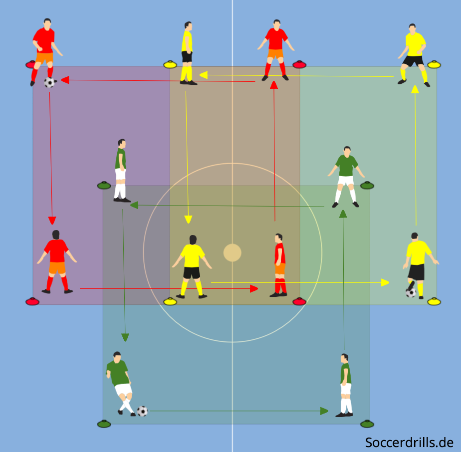 - Auf Trainerkommando „Rotation“ erfolgt ein Dribbling des Ballbesitzers und dieser dribbelt gegen den Uhrzeigersinn ins nächste Übungsfeld. Seine Mitspieler folgen ihm und besetzen die freien Positionen im neuen Feld. Im neuen Übungsfeld geht das Passspiel wie gewohnt weiter.