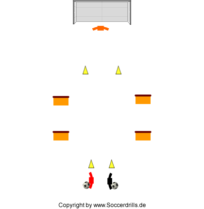 Im Wettkampf erhält dann der Spieler, der zuerst am Hütchentor ankommt einen Punkt und trifft er, gibt es noch einen Punkt als Belohnung dazu. Einfach und schnell aufgebaut wird dieser spannende Ablauf und kann auch auf Kleintore durchgeführt werden.