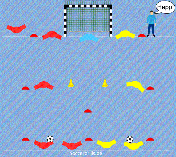 - Wir benötigen 8 Bodenmarkierungen, 2 Hütchen, ausreichend Bälle und ein Tor mit Torwart.