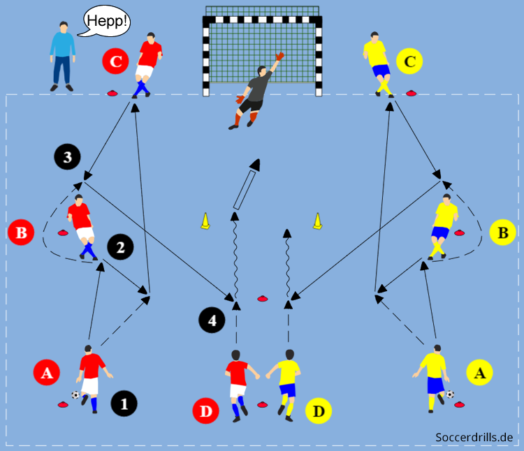 - Die C-Spieler passen auf B, diese passen zur Passmarkierung im Zentrum.